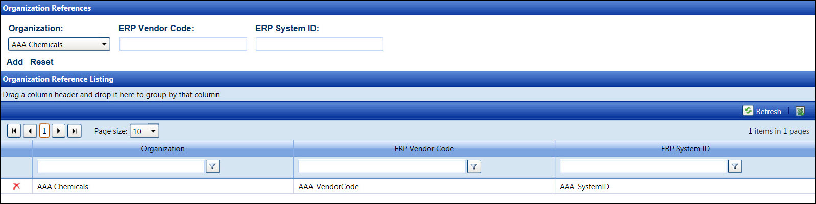 Click Add to save and display the ERP vendor code and/or ERP system ID in the Organization Reference Listing.
